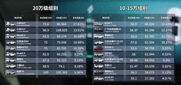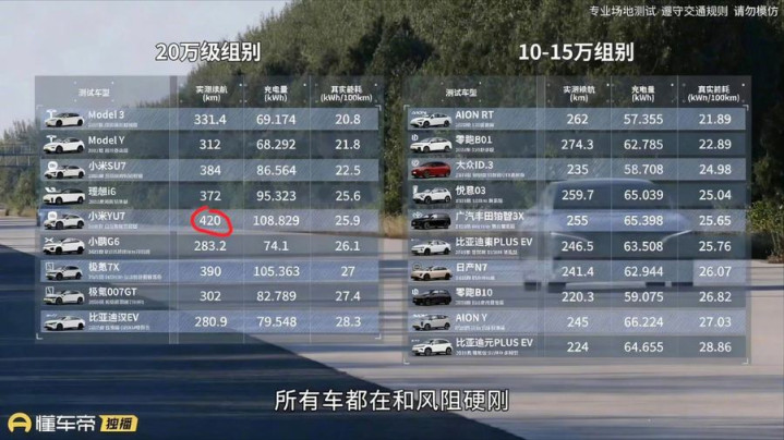 最终,小米SU7凭借其73.6度电池在测试中跑了384公里,达成率54.86%,成为20万级别车中续航达成率最高的车型;而小米YU7则以96.3度电池,实际续航达到420公里,成为全场跑得最远的车型,这两项成绩都无疑为小米汽车的续航能力加分。