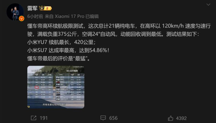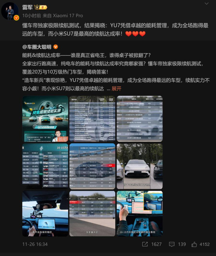 今日,雷军在微博上分享了一项由懂车帝进行的极限续航测试结果,引起了不少网友的热议。在这次极限续航测试中,小米两款车型——SU7和YU7以出色的表现,分别在续航“达成率”和“实际里程”上脱颖而出,挑战了市场上最具代表性的电动车——特斯拉。但是,这个话题也引发了不少争议江西炒股配资平台,关于小米和特斯拉续航差距的问题,一时间成为了车迷们关注的焦点。