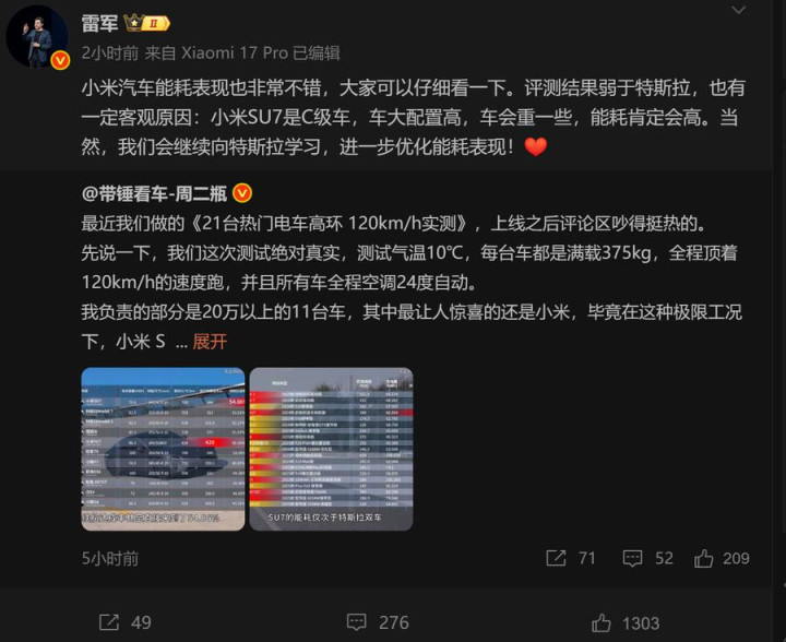 雷军并未回避小米和特斯拉之间的差距,反而直言不讳:“小米SU7是C级车,车大配置高,车重也重,能耗自然较高。”这番话也获得了一些网友的理解,毕竟车身重量与配置的高低,确实会影响到续航表现。